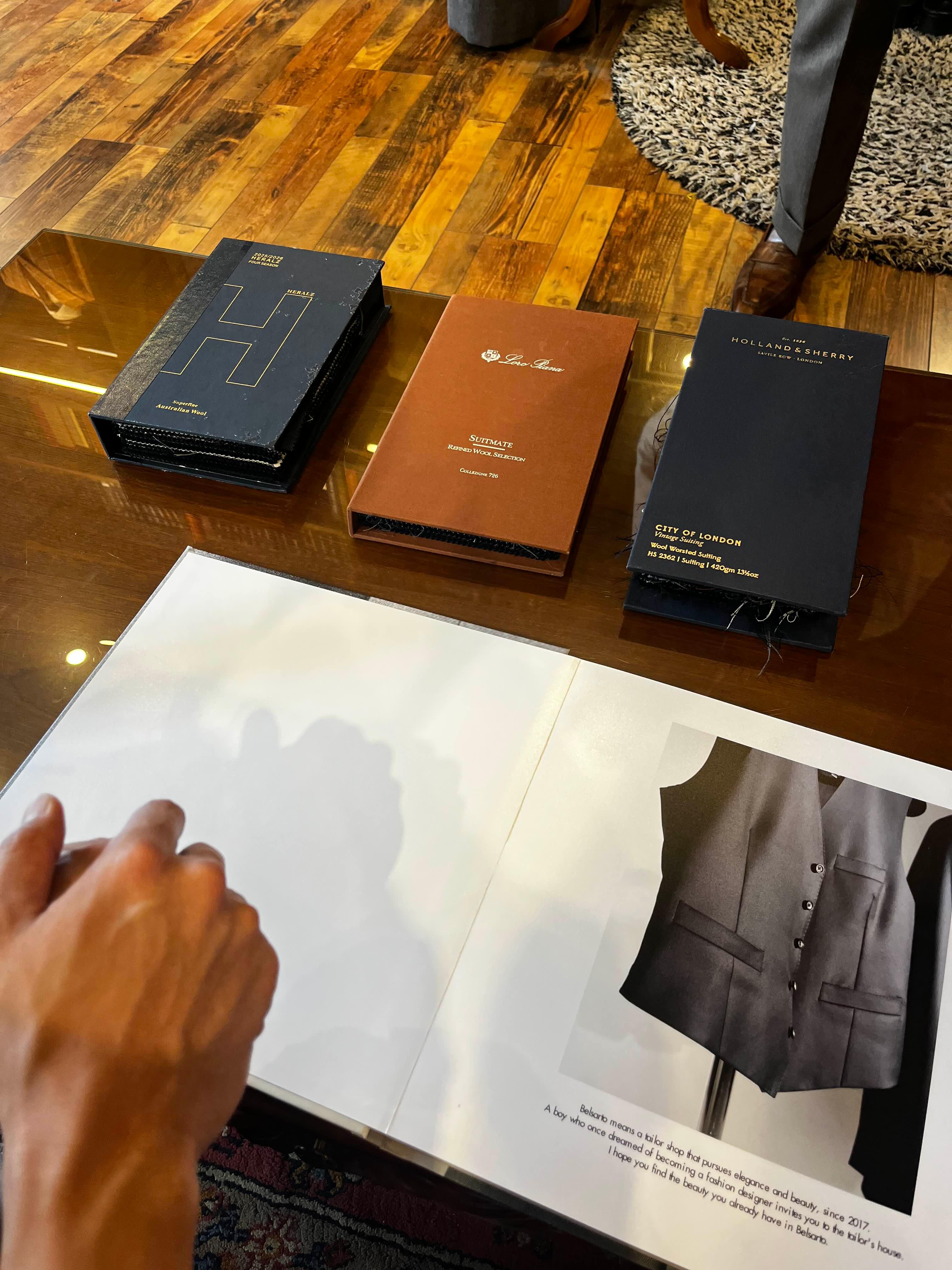 앉아서 정장 스타일, 원단 종류, 분위기 등을 전반적으로 설명해주시고